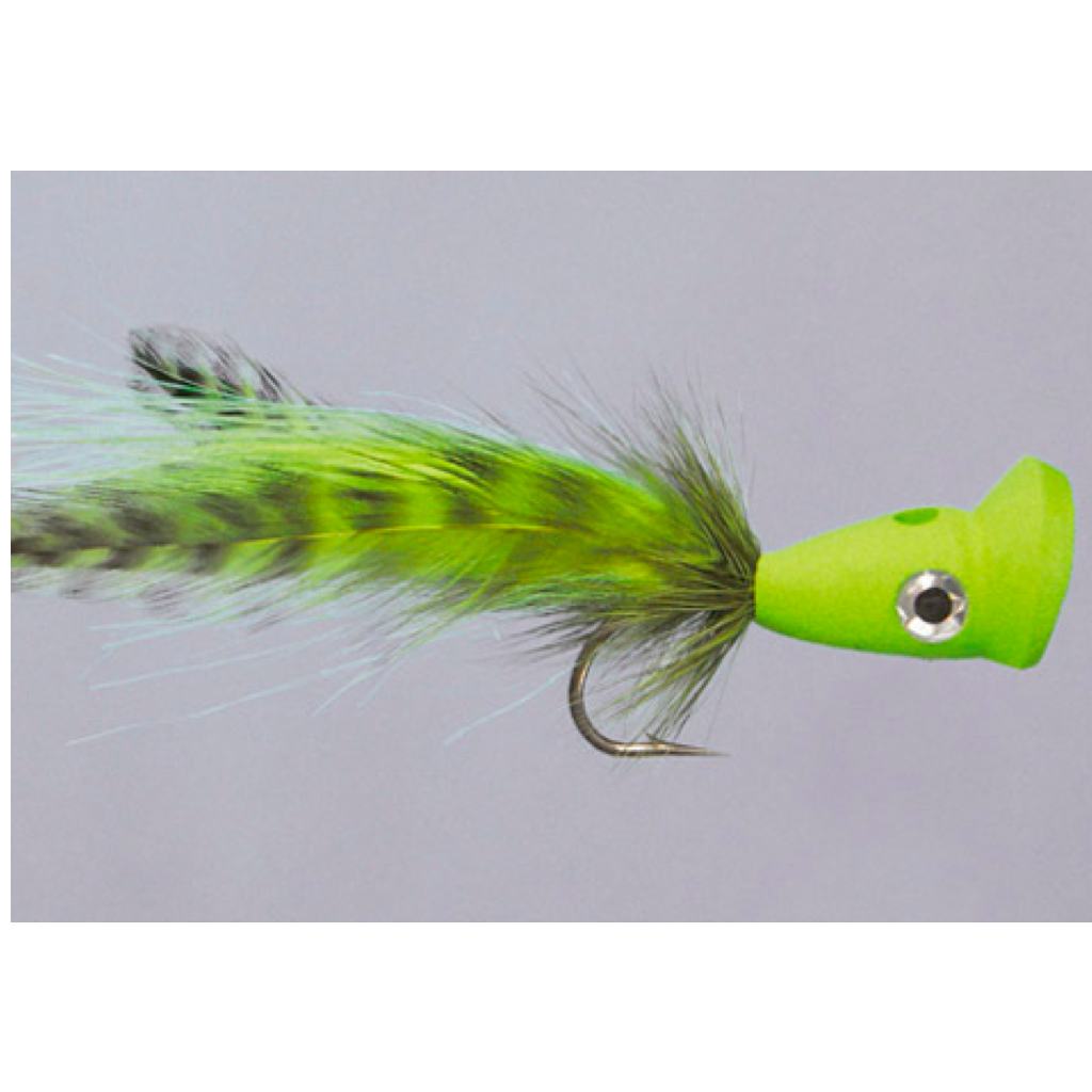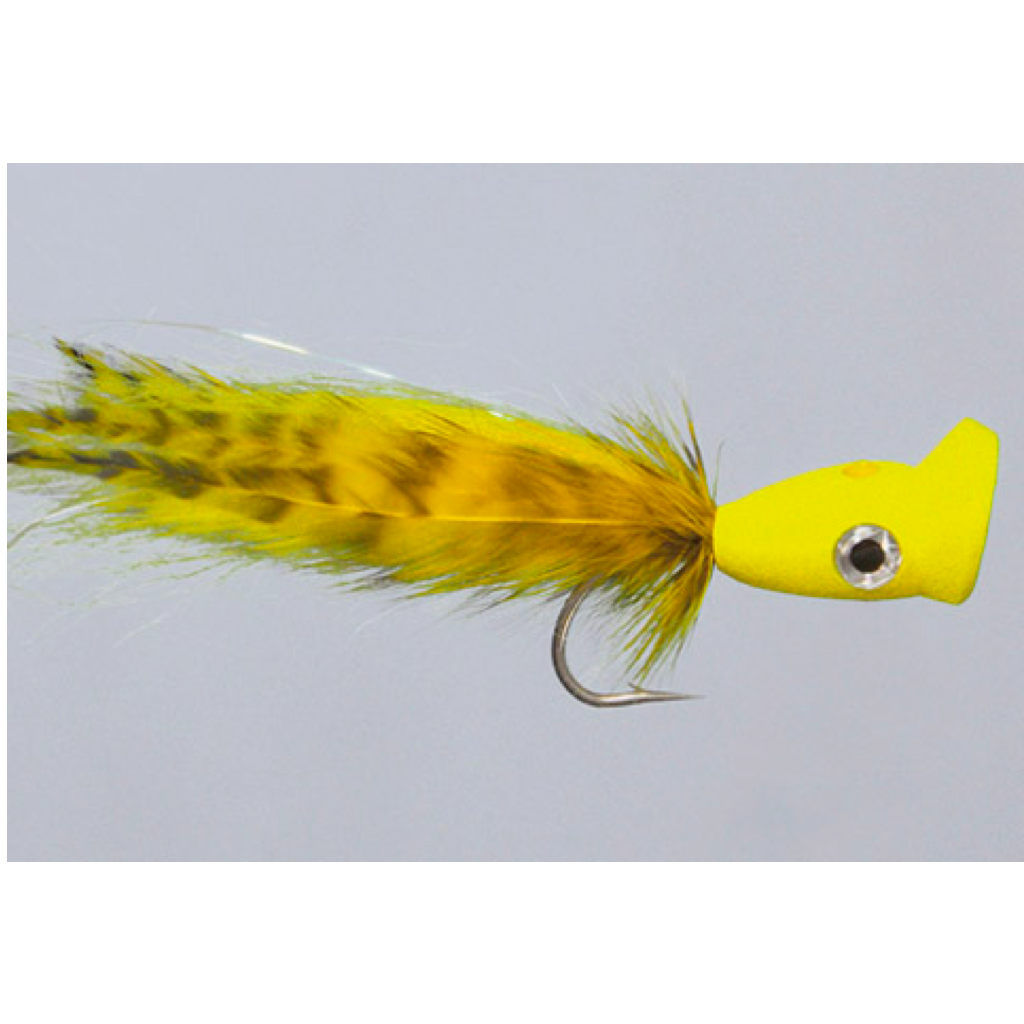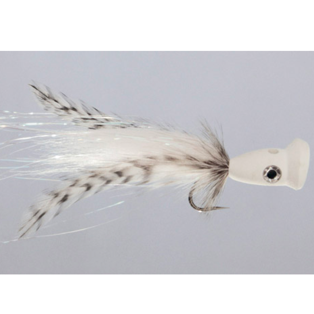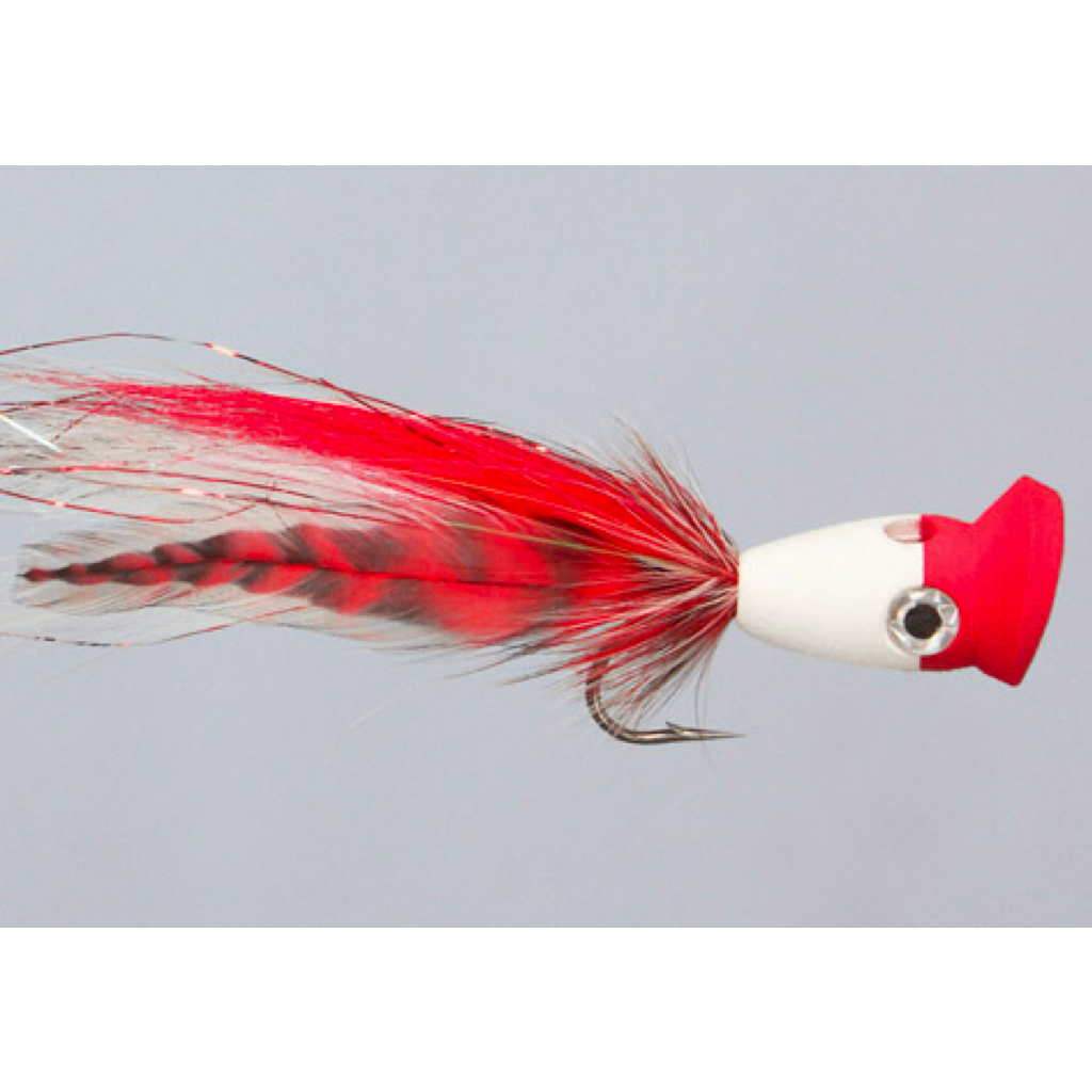 Pike, Muskie, Blues, Stripers, Roosters, Peacock Bass, pretty much anything big enough to eat this fly probably will. With a channeled popper head, this fly will kick big splashes and create a bubble trail to induce agressive strikes. This fly is 5" long and tied on a heavy duty big-game hook.