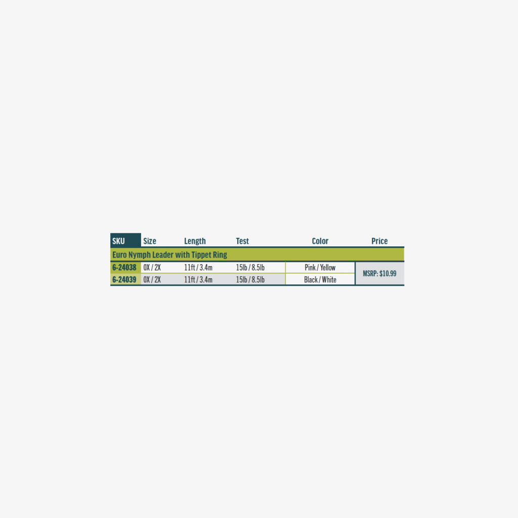 RIO'S Euro Nymph Leader is a uniquely designed tapered leader, and ideal for European nymphing techniques. The leader starts with 9' of a milky-white tapered nylon for visibility, which is then attached to 22" of RIO's 2X, two-tone Indicator Tippet material, for maximum visibility in all light conditions, and to make subtle strike detection easier. The leader ends with a tippet ring, allowing anglers to attach their own tippet to match the water type and conditions.A uniquely designed, tapered leader - perfect for European nymphing methods.